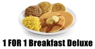 ![]() Deluxe Breakfast with Hotcakes, Scrambled Eggs, Sausage Patty, Hash Browns and Biscuit. | |